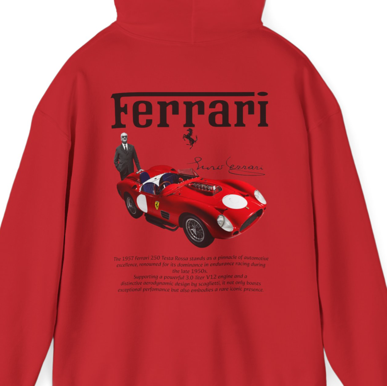 Crafted with meticulous attention to detail, this hoodie celebrates the iconic Ferrari 250 Testa Rossa in a striking shade of red. Whether you're a racing enthusiast or simply appreciate the fusion of style and history, this hoodie allows you to carry the legacy of the Testa Rossa with you. Drive in style, wear with racing pride.