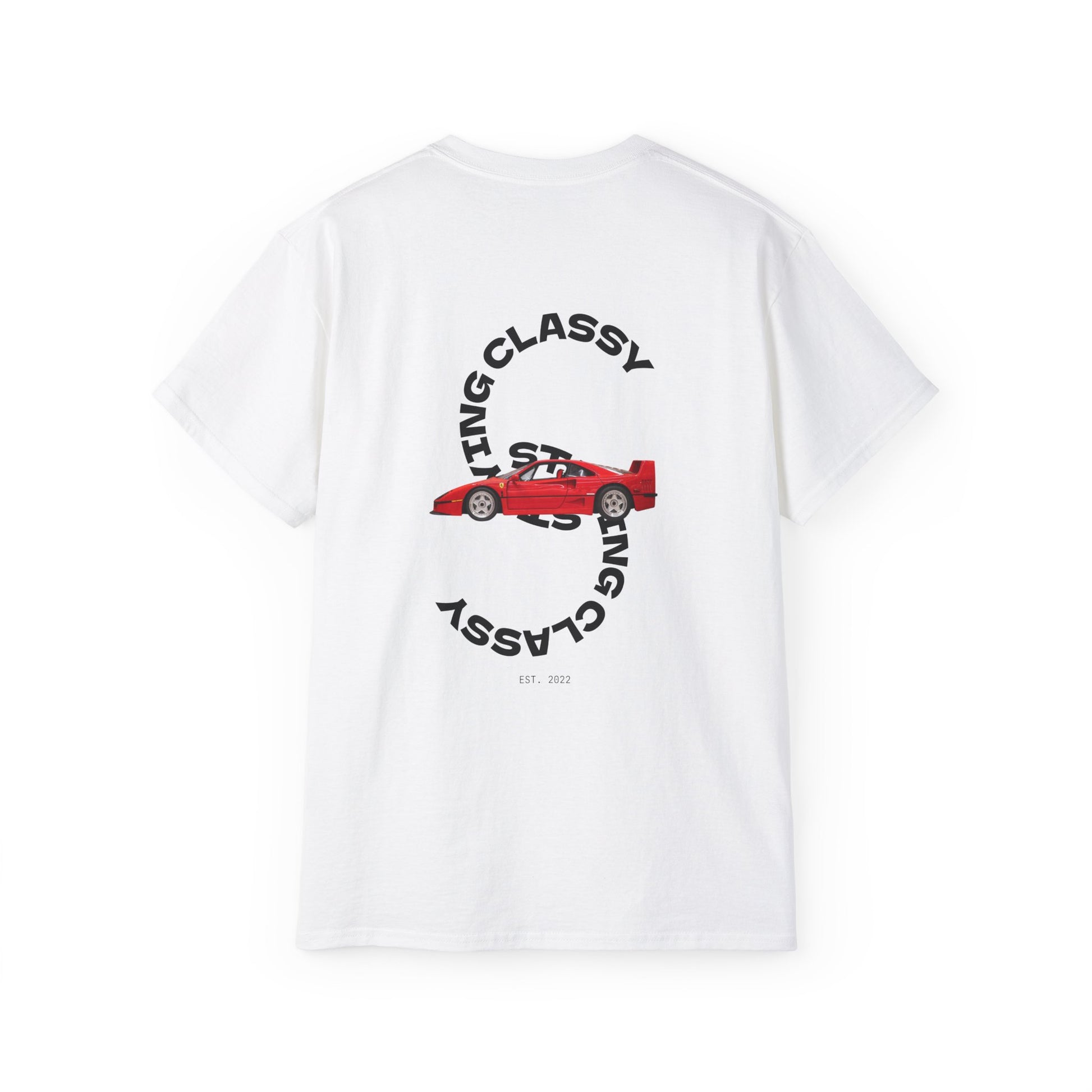 Known for its raw performance, iconic wedge-shaped design, and status as the last Ferrari personally approved by Enzo Ferrari, the F40 represents pure automotive passion. The bold rear print features a detailed illustration of the car, framed by our “Staying Classy” design, symbolizing timeless style and speed.